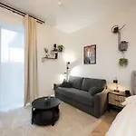 The apartment overlooks the patio and comprises a patio, a sitting area, and a living room with air conditioning. The property features a bathroom with hair dryers and bath sheets. Furthermore, a walk-in shower and a separate toilet is available.